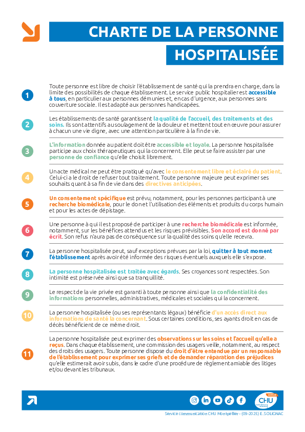 - L’information donnée au patient doit être accessible et loyale. La personne hospitalisée participe aux choix thérapeutiques qui la concernent. Elle peut se faire assister par une personne de confiance qu’elle choisit librement.