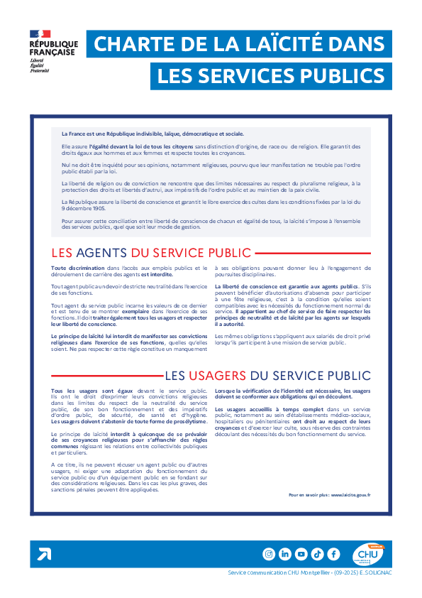 Tous les usagers sont égaux devant le service public. Ils ont le droit d’exprimer leurs convictions religieuses dans les limites du respect de la neutralité du service public, de son bon fonctionnement et des impératifs d’ordre public, de sécurité, de santé et d’hygiène. Les usagers doivent s’abstenir de toute forme de prosélytisme.