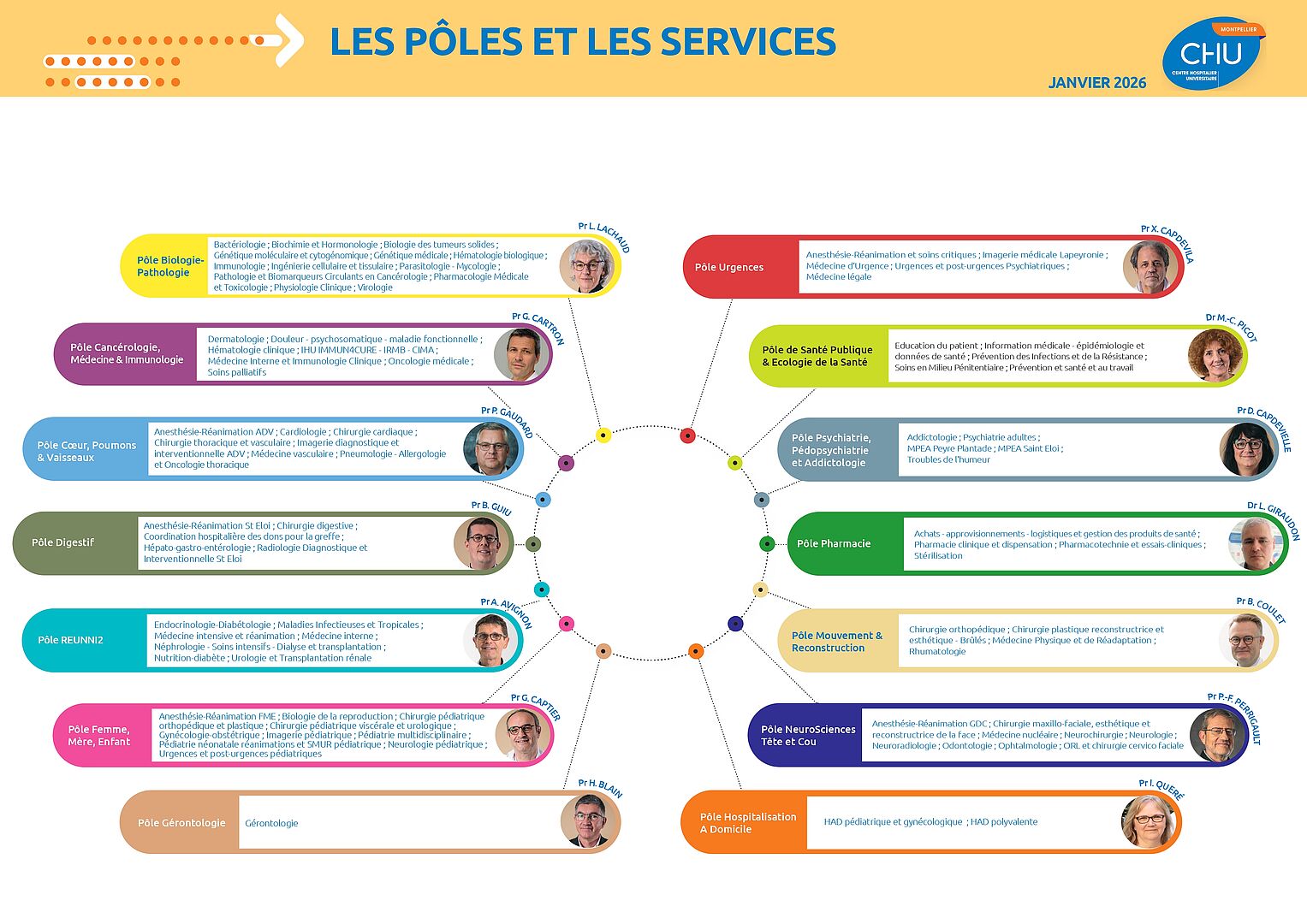 L'Offre de soins détaille l'organisation médicale en pôles, services et équipes médicales. Elle est accessible dans le menu Patients et Visiteurs > Offre de soins et Acteurs de santé > Offre de soins. Le module de recherche situé sur la page d'accueil permet un accès direct aux pages des services et des médecins.