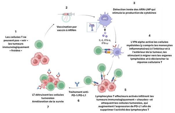 L’effet de vaccins à ARNm déjà disponibles (dirigés contre la protéine spike du SARS-CoV-2), au-delà des vaccins antitumoraux en cours de développement, a ainsi été testée. L’étude clinique rétrospective a comparé des patients atteints de cancer bronchique non à petites cellules (CBNPC) ou de mélanome, traités par ICI et vaccinés ou non par ARNm anti-SARS-CoV-2 dans les 100 jours précédant l’immunothérapie. Les résultats montrent une amélioration nette de la survie globale des patients atteints de CBNPC (survie globale à 3 ans 30,8 % versus 55,7 %, HRajusté 0,51 ; IC95% 0,37-0,71) et de mélanome (survie globale à 3 ans 44,1 % vs 67,6 % ; HRajusté 0,37 ; IC95% 0,18-0,74). Ces bénéfices n’ont en revanche pas été observés avec des vaccins non ARNm (grippe, pneumocoque) ou encore chez des patients vaccinés par vaccins à ARNm anti-SARS-CoV-2 mais traités par chimiothérapie. Par ailleurs, l’analyse de cohortes de biopsies tumorales a montré une augmentation significative du taux d’expression de PD-L1 (TPS) après une vaccination ARNm, modifiant potentiellement l’éligibilité thérapeutique de certains patients. D’après les résultats obtenus chez l’animal, les vaccins à ARNm, encapsulés dans des nanoparticules lipidiques, stimuleraient, indépendamment de l’antigène codé, la production de cytokines antivirales, notamment l'IFNα, entraînant une activation de l’immunité innée (cellules présentatrices de l’antigène). Les cellules immunitaires innées résidant dans la tumeur, activées par cette poussée de cytokines, prépareraient les lymphocytes T à s'activer et infiltrer les tumeurs. Bien que les cellules tumorales échappent à l'attaque en régulant à la hausse l'expression du PD-L1 (évaluée sur des cohortes de biopsies tumorales), l'association d’un ICI aux vaccins à ARNm permettrait de surmonter cette réponse compensatoire, provoquant une régression tumorale et une amélioration de la survie.